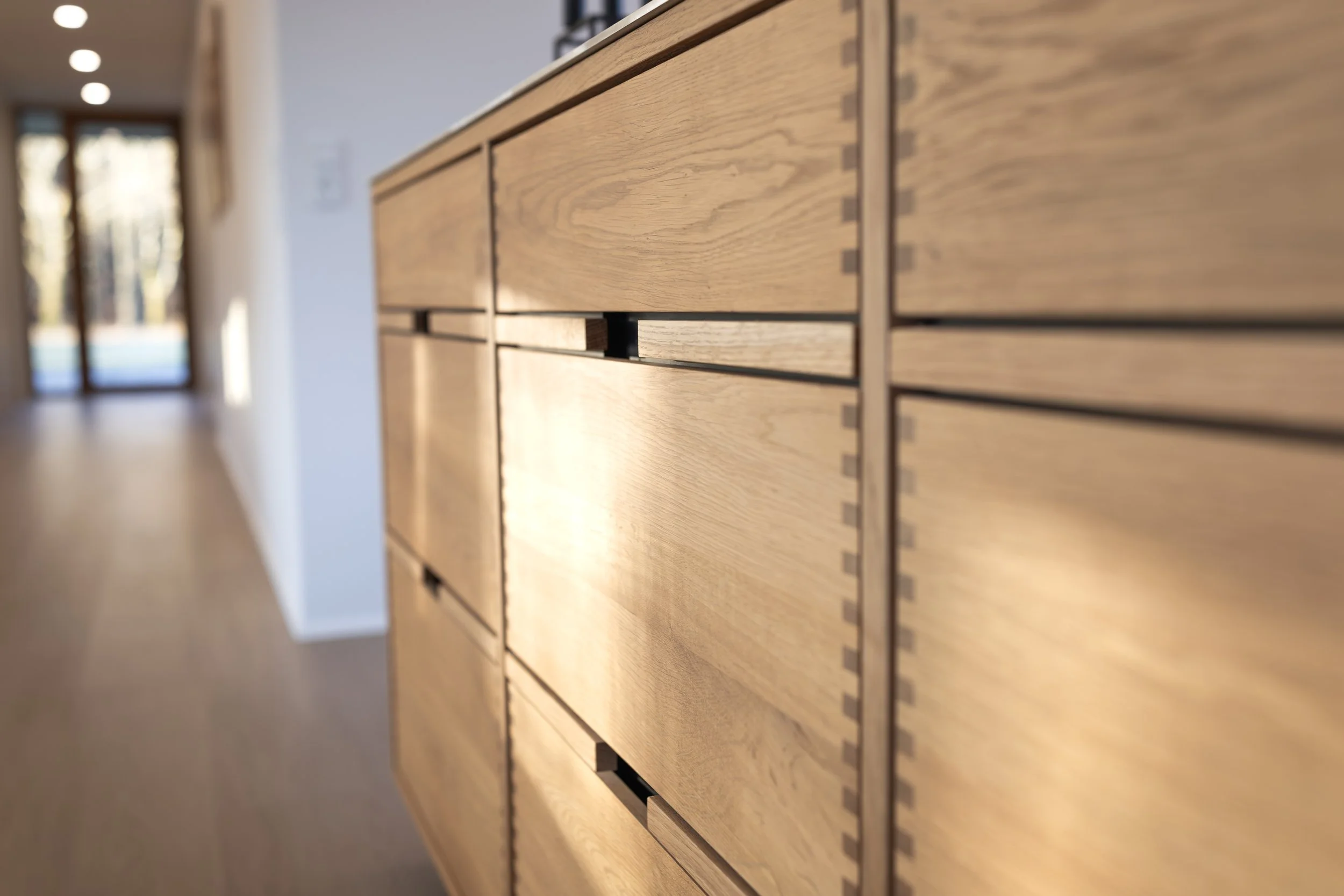 Det nordisk køkken er et sandt mesterværk imed finererede skabe og synlige massive træskuffer, der fremviser det enestående snedkerhåndværk med fingertappede samlinger. Hver detalje er udført med omhu og præcision, hvilket giver rummet en unik kvalitet og varme.
